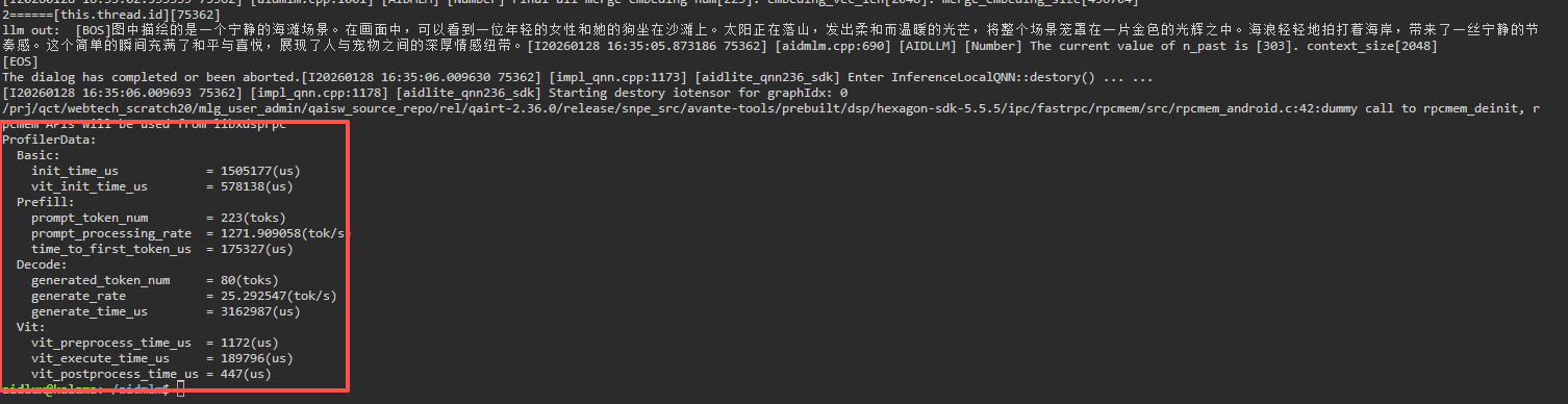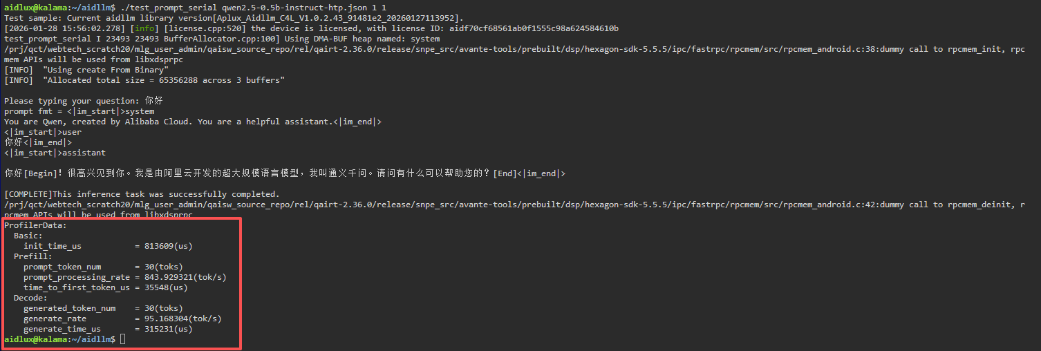 ./test_prompt_serial qwen2.5-0.5b-instruct-htp.json 1 1- After entering the conversation content in the terminal, you will see the following log information: