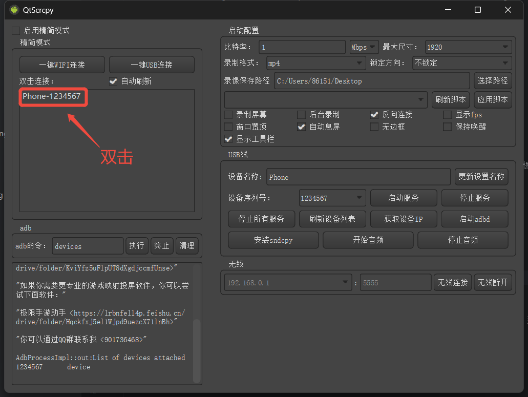 打开 QtScrcpy 应用可以发现板卡设备,双击即可访问设备屏幕